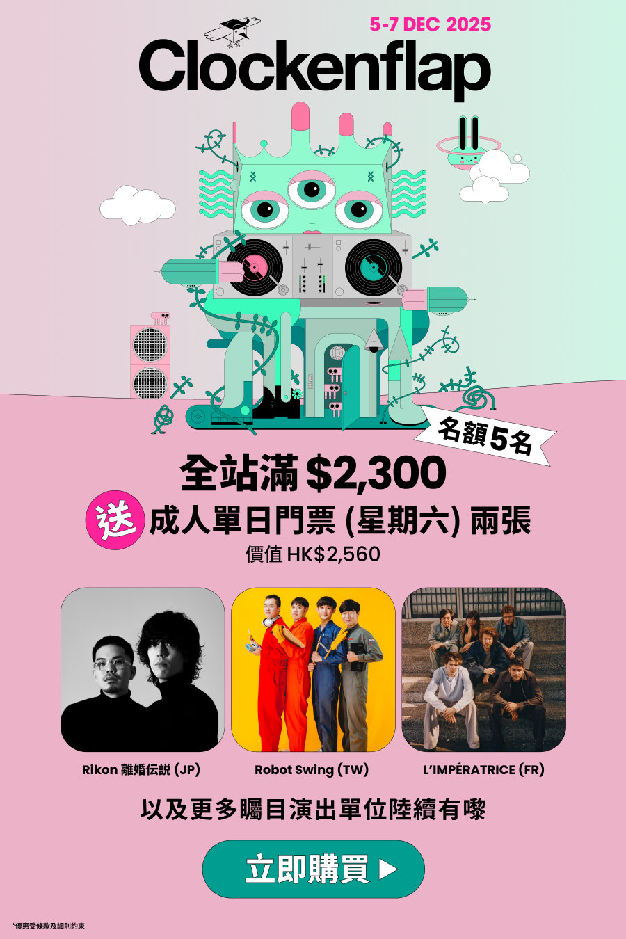 購物滿 $2300,送你 Clockenflap 成人單日門票 2 張! 今年陣容超強,準備好跟我們一起搖滾全場 🎤 立即購物,門票等你帶走!