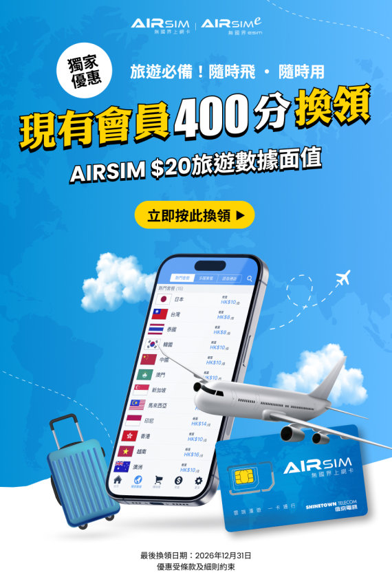 4月復活節長假期話咁快就到🎒 無論係去日本、泰國定返內地深圳玩,最緊要有一張穩定嘅旅遊SIM喺手,隨時隨地打卡 Share Story、搵路、搵食都咁方便!📸🥢而家會員只要用 C400分,就可以兌換 AIRSIM HK$20旅遊面值 ! 無論你新用戶想拎張新卡,定係現有用戶想加錢買Data,通通都有份!立即換領 >>