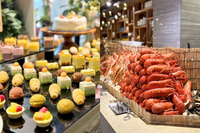 海鮮有即開時令生蠔、龍蝦、雪蟹腳、青口、蝦。刺身則有帶子、雕魚、三文魚、希靈魚、八爪魚、鯖魚。西班牙乳豬、法式寶雲酥羊架和美國燒牛肋骨、花菇鴨掌扣、原隻鮑魚、泰式生蝦等都是必食。中式時令燉湯、點心、鑊氣小炒、即制拿破崙、時令中式糖水、自家製Gelato榴槤雪糕及多款精緻甜點,都不能錯過。