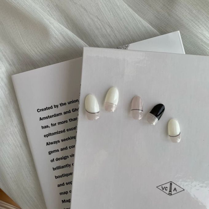喜歡簡約設計的話,可以考慮這款法式圓舞曲凝膠甲貼,以柔和的淡粉紅和黑白色為主調,結合法式美甲的經典圓弧設計,呈現優雅浪漫的氛圍,搭配光滑無瑕的表面,為整體增添奢華感。