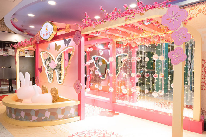 庭園用上應節的桃紅色搭配奪目橙黃兩色作主調,四周掛著翩翩起舞的蝴蝶,加上懸浮於半空、猶如撲翼蝴蝶的流線形裝飾,在中庭的陽光映照下,形成獨特的光影效果,勾勒出繁花似錦、蝶舞翩翩的意境。
