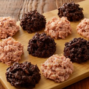 製作過程﹕將白朱古力融化後平均分為兩等份,然後分別加入士多啤梨或可可粉,拌以預先炒香了的碎果仁,以及曲奇脆米,做成你想要的形狀後,冷藏約10分鐘即成。 困難﹕這款甜品很容易製作,但是要做成大小一致而完整的形狀,要花一點耐性。