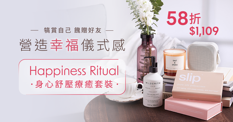 Cosmart Shop Happiness Ritual 身心舒壓療癒套裝含4款暢銷產品,包括尊奢精品潔膚露讓身心靈得到淨化、伴隨著播放輕鬆療癒音樂的藍芽喇叭及藏紅花和雪松味的香氛蠟燭,讓自己沈浸於舒適的氛圍中,緩解壓力疲勞,身心放鬆,配搭使用絲綢般觸感的枕頭套, 盡情享受極致奢華的睡眠!